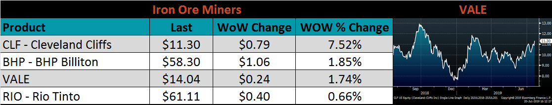 Below are inventory levels for Chinese finished steel products and iron ore. Each of the inventory levels increased on the week. The HRC inventory level has increased by more than 100k over the last three weeks and is at the highest level for July since 2015. Iron ore inventory levels have begun to stabilize as Vale ramps up shipments out of Brazil following the Brucutu mine closure during the first half of the year. It will be interesting to see how much ore restocking occurs before winter production cuts in China.