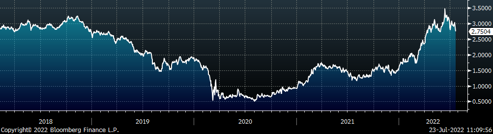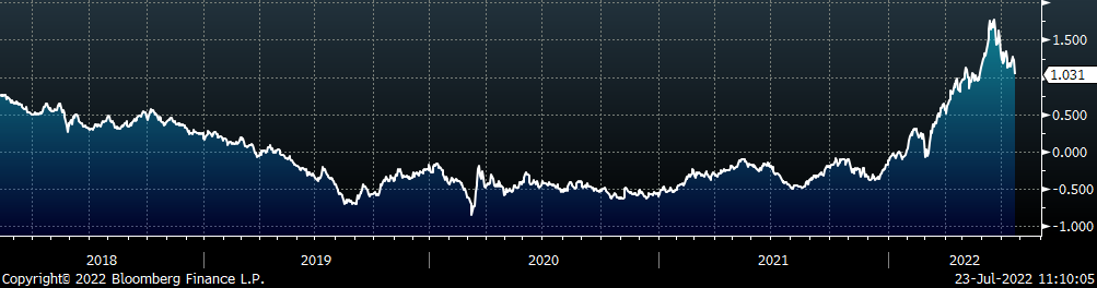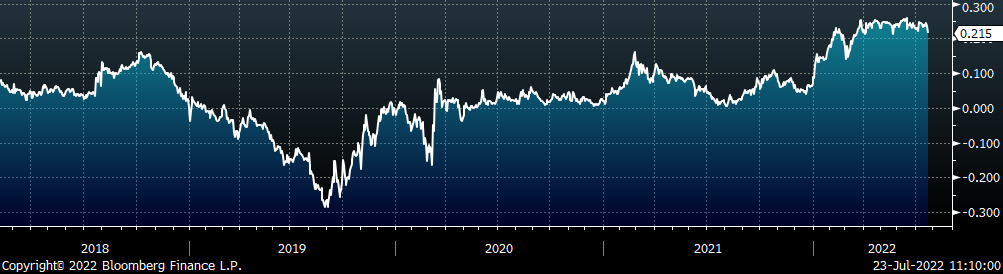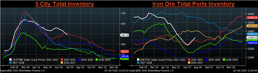 Additionally, the chart below shows inventory levels at key mills, which appear to have peaked in mid-June, with production in the region also down 7.1% compared to July of last year.