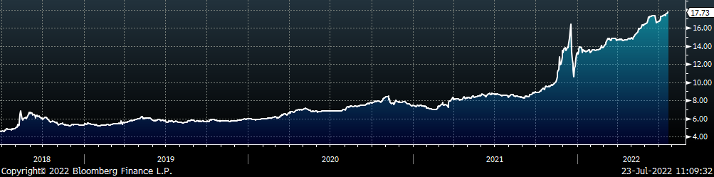 The Chinese price was among the first global HRC prices to start trending lower after the initial run up caused by the Russian invasion of Ukraine. This was primarily because it became clear that China would be a safe harbor for Russian material, but also because the COVID-zero policy which led to domestic lockdowns was bearish for their demand. The chart below shows the Chinese domestic price (translated into USD/s.ton), the current level is at its lowest since October 2020.