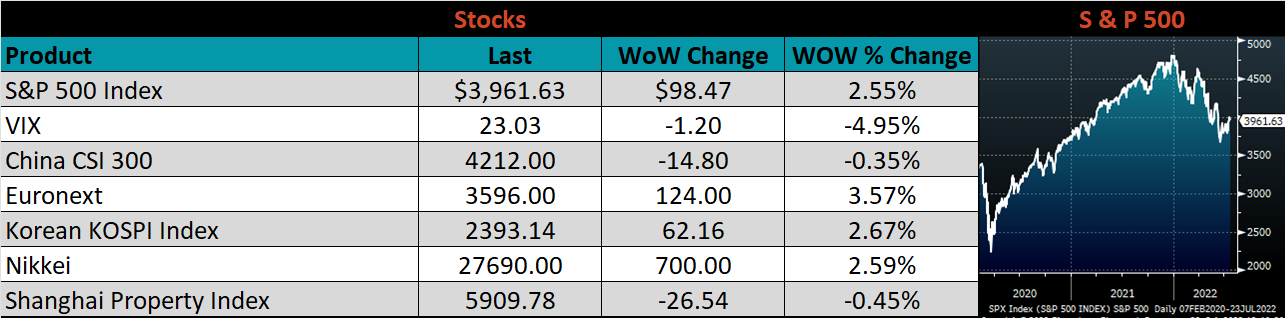Last week, the August WTI crude oil future fell $2.89 or 3% to $94.70/bbl. The aggregate inventory level decreased 0.1%. The Baker Hughes North American rig count increased 6 rigs, while the U.S. rig count increased 2 rigs.