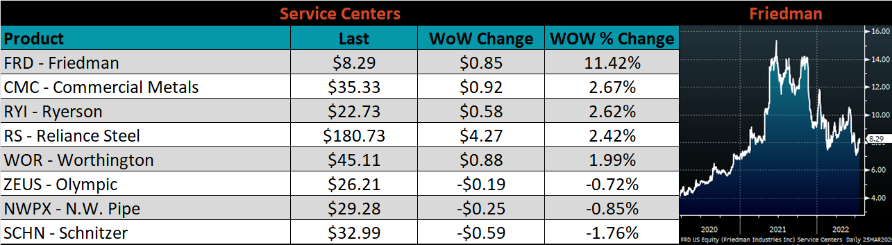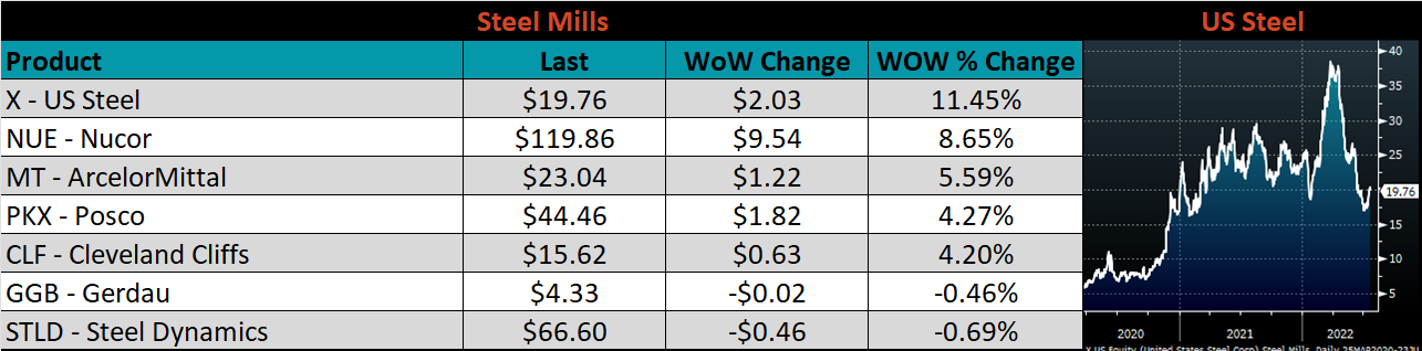 Below is the Midwest HRC price vs. each listed country’s export price using pricing from SBB Platts. We have adjusted each export price to include any tariff or transportation cost to get a comparable delivered price. Differentials decreased across the board as their corresponding prices fell more significantly that the U.S. domestic price.