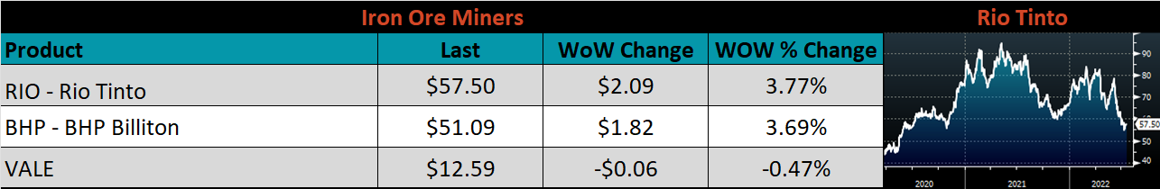 Raw material prices moved primarily lower last week with losses led by Pig Iron Brazil, down 16.5%. SGX ORE 2m Futures rose the most, up 8.4%