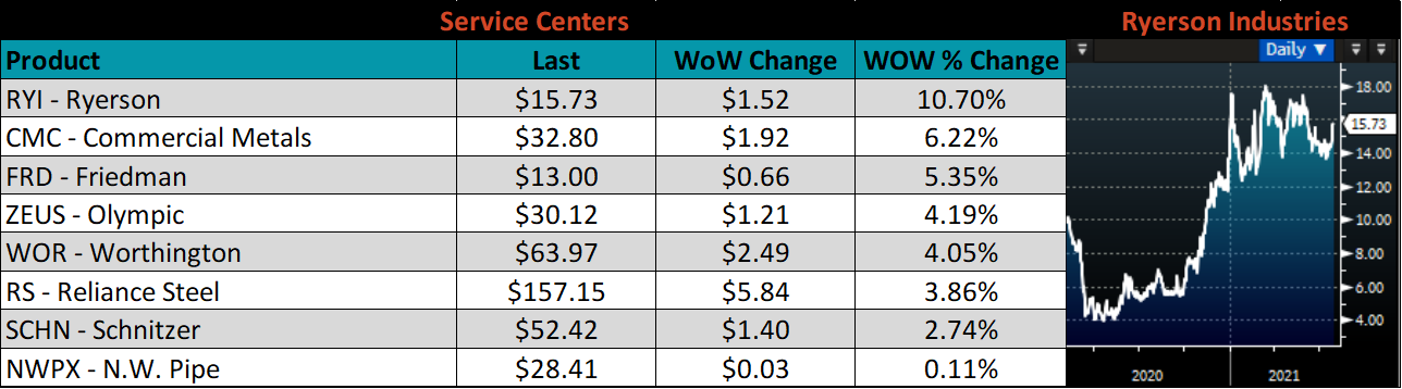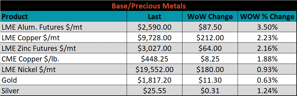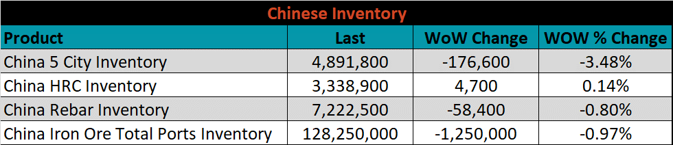 SBB Platt’s HRC, CRC and HDG pricing is below. The Midwest HDG, HRC, & CRC prices were up, 1.9%, 1.4% and 1%, respectively. Globally, the Chinese domestic HRC price was up 2%.