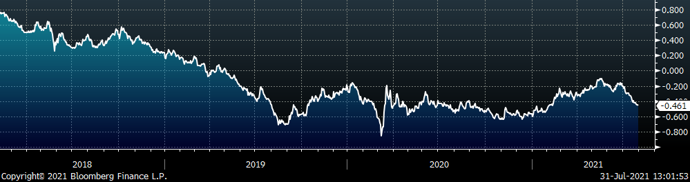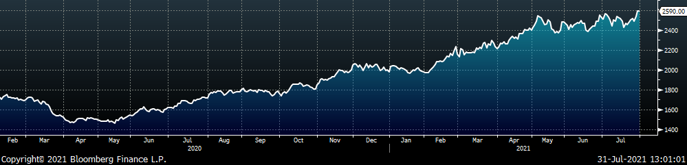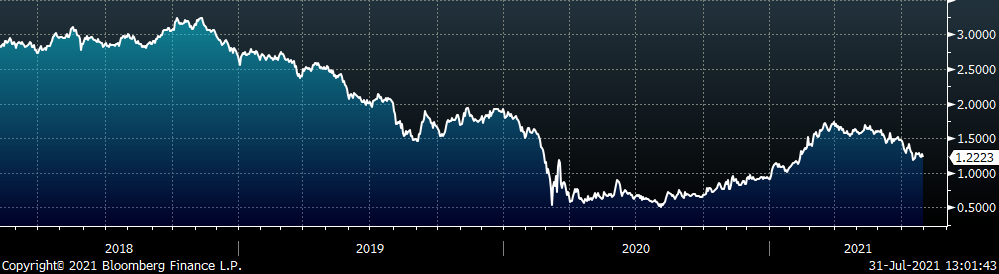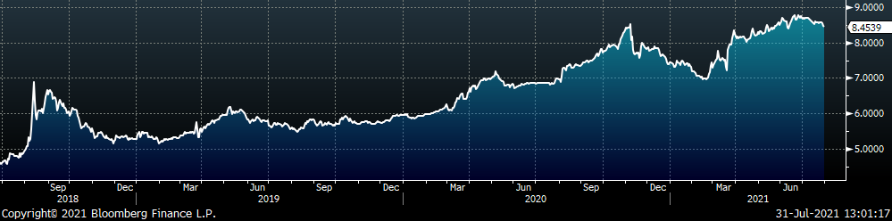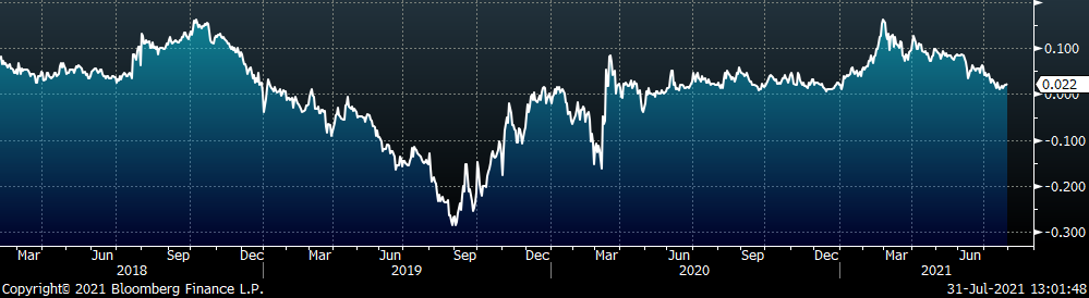 Last week, the September WTI crude oil future was up another $1.88 or 2.6% to $73.95/bbl. The aggregate inventory level was up 1.2%, while crude oil production slipped to 11.2m bbl/day. The Baker Hughes North American rig count was up 1 rig, while the U.S. rig count was down 3 rigs.