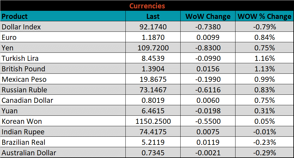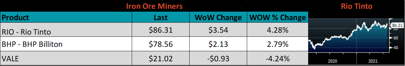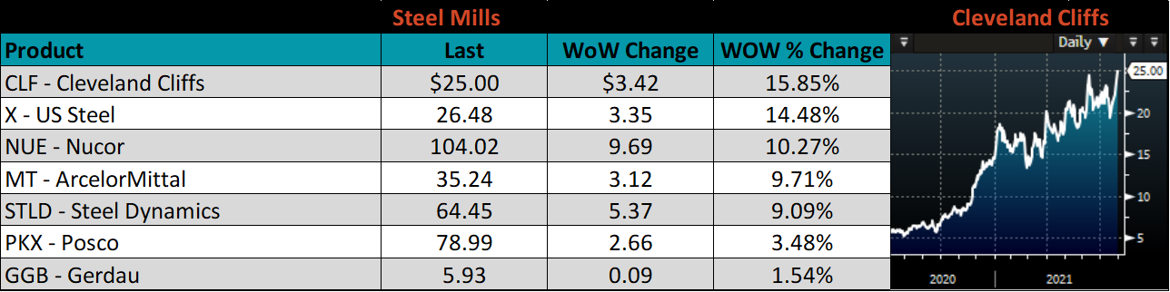 The CME Midwest HRC futures curve is below with last Friday’s settlements in white. Last week, the entire curve shifted higher, most significantly in the front months, as demand and spot prices continue to increase.