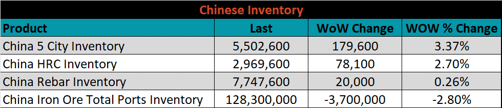 The CME Midwest HRC futures curve is below with last Friday’s settlements in white. The curve shifted slightly higher across all expirations.