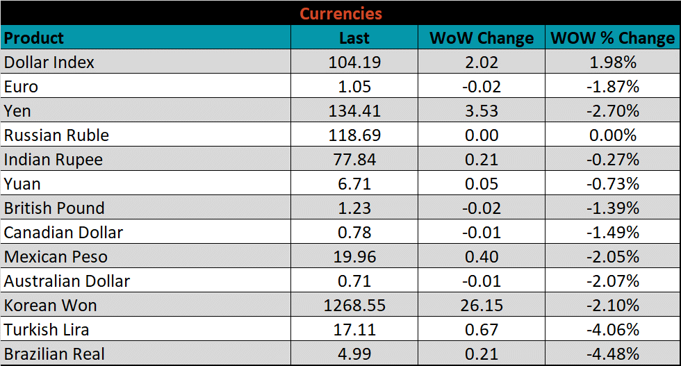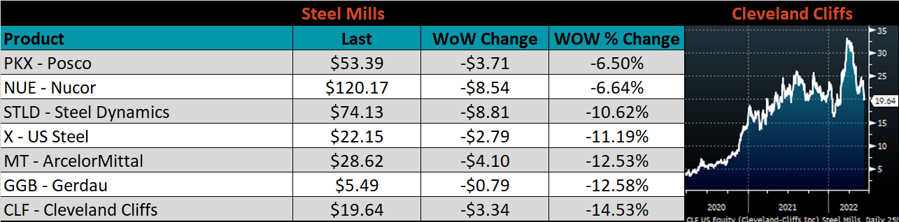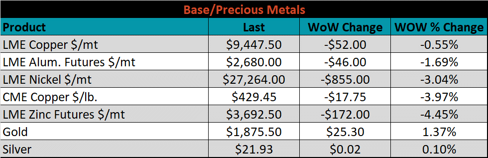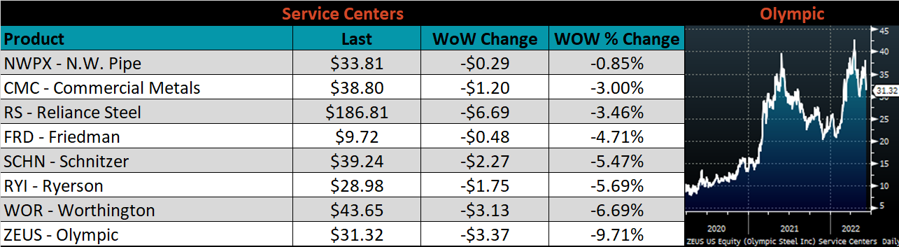 SBB Platt’s HRC, CRC and HDG pricing is below. The Midwest CRC, HDG & HRC prices were down 4.9%, 3.5%, & 3.4%, respectively. Outside of the U.S., the Russian HRC export price was down the most, down 16.8%.