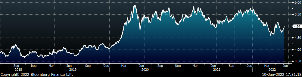 Last week, the July WTI crude oil future gained $1.80 or 1.5% to $120.67/bbl. The aggregate inventory level was up 0.5% and crude oil production was steady at 11.9m bbl/day. The Baker Hughes North American rig count was up 30 rigs, and the U.S. rig count was up 6.