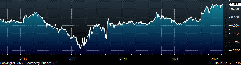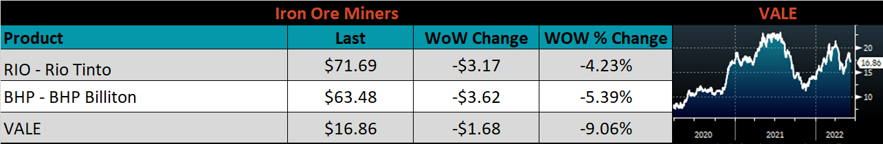 Below is the iron ore future curve with Friday’s settlements in orange, and the prior week’s settlements in green. Last week, the entre curve shifted slightly lower.