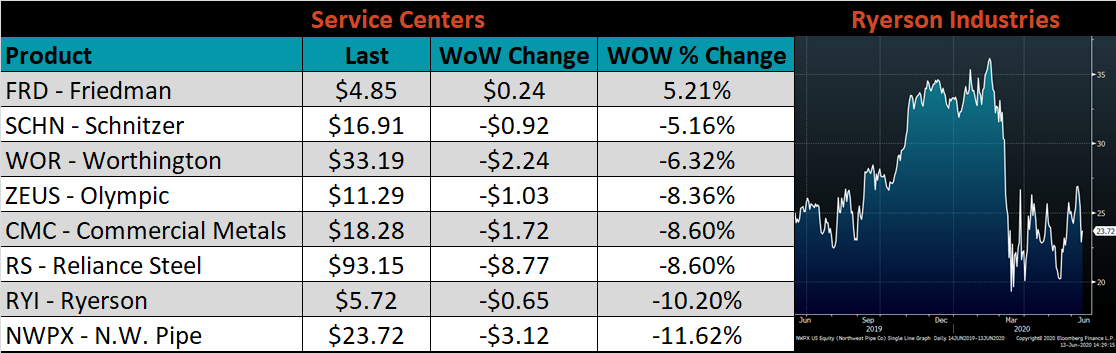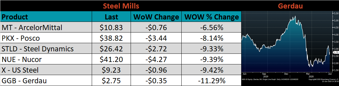 Below is the Midwest HRC price vs. each listed country’s export price using pricing from SBB Platts. We have adjusted each export price to include any tariff or transportation cost to get a comparable delivered price. The Turkish, Korean, Russian and Chinese differentials all decreased, as the U.S. price was up only slightly compared to each countries higher price. The Brazil price, however, was flat and its differential moved higher.