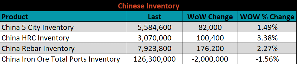 Below is the Midwest HRC price vs. each listed country’s export price using pricing from SBB Platts. We have adjusted each export price to include any tariff or transportation cost to get a comparable delivered price. Differentials decreased across the board less Europe, whose price decreased more than the U.S. price.