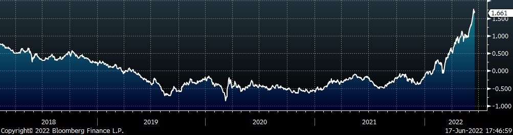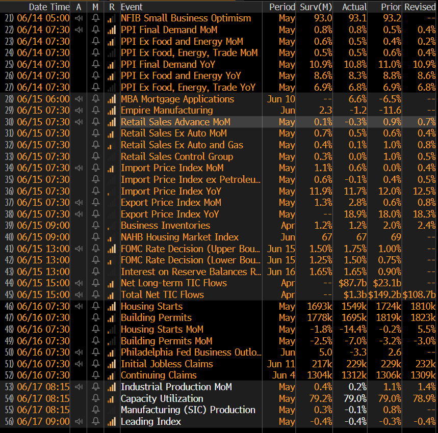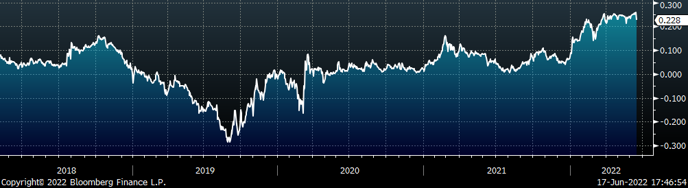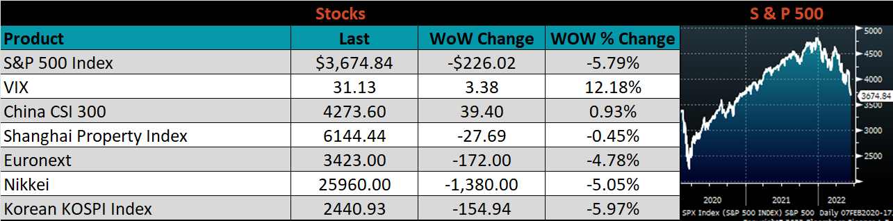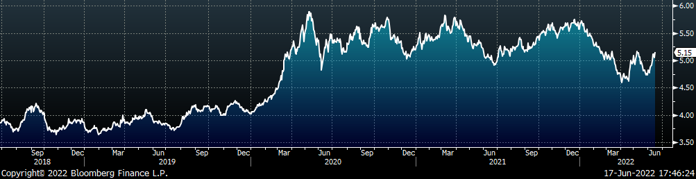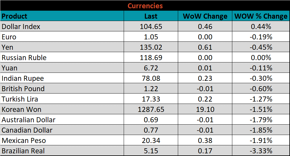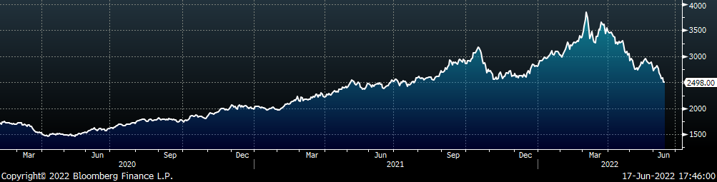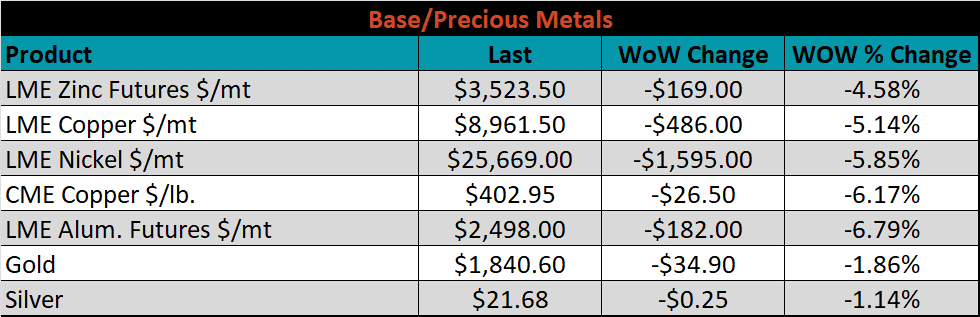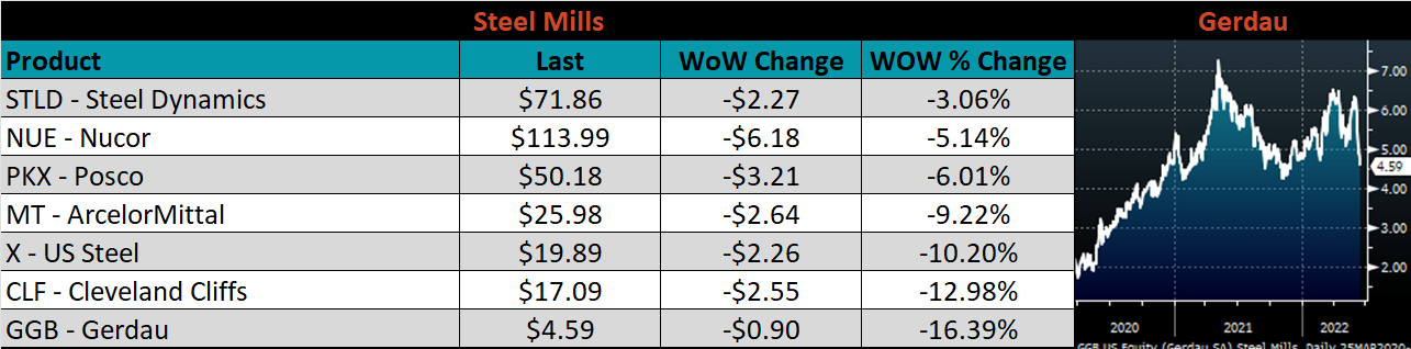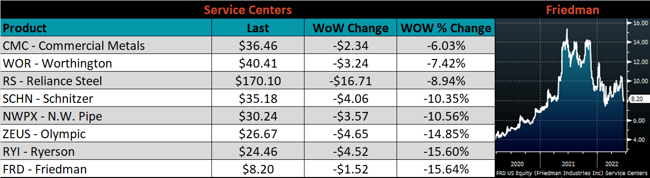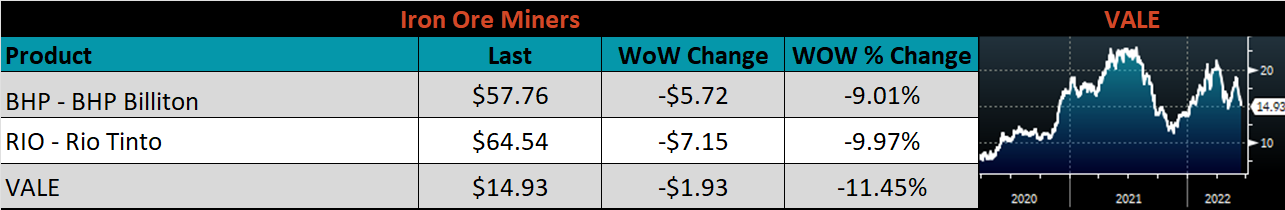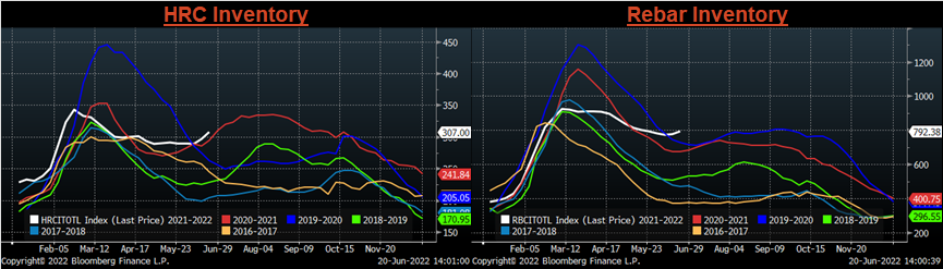 The CME Midwest HRC futures curve is below with last Friday’s settlements in white. The entire curve shifted lower, most significantly in the front, indicating concern around lower demand amid an increasingly hawkish Fed.