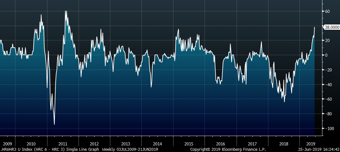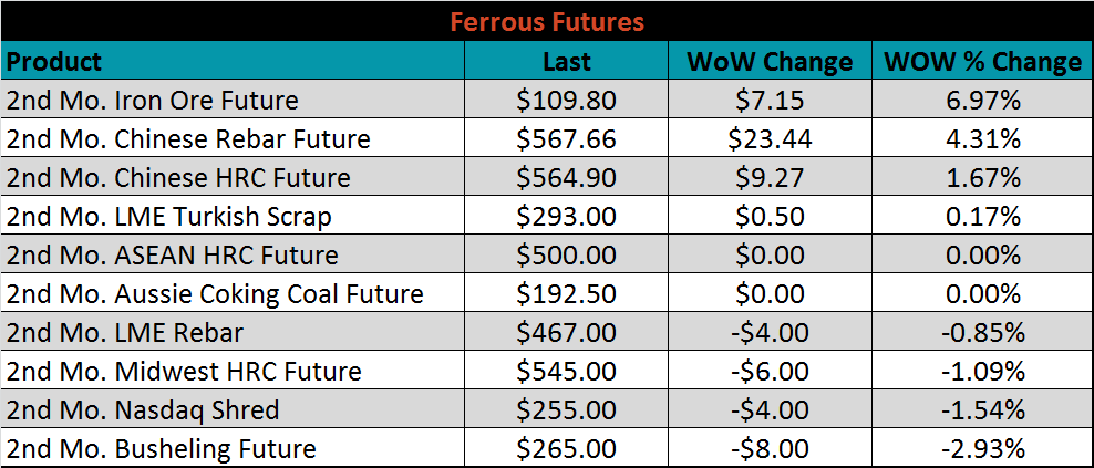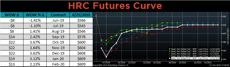 The CME Midwest HRC futures curve is shown below with last Friday’s settlements in white. The back of the curve shifted higher, while the front was little changed.