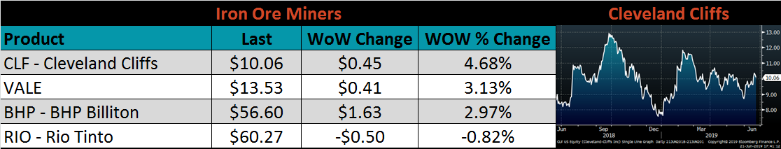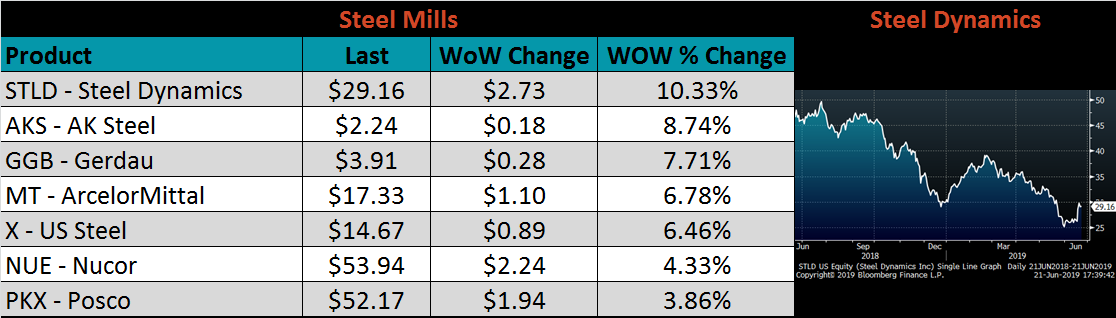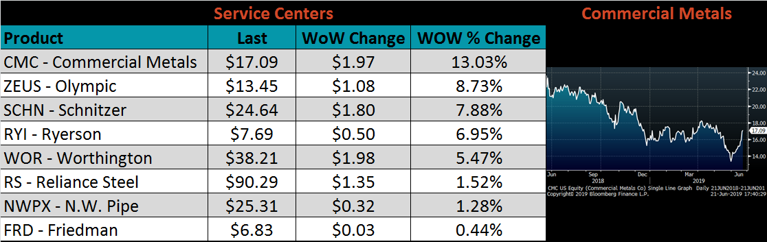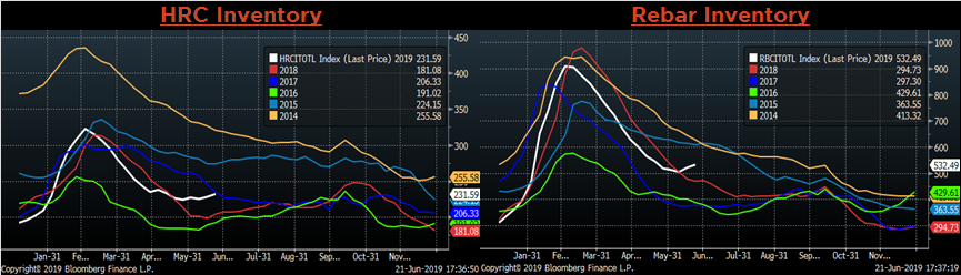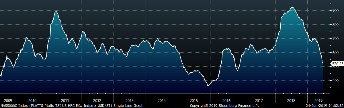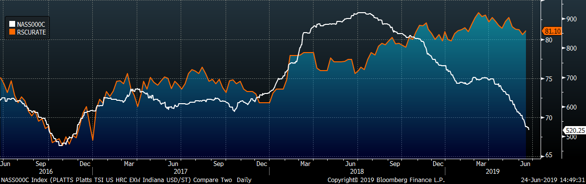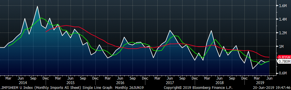 The AISI Capacity Utilization Rate was up 0.5 points to 81.1%. Last week, US Steel announced extended outages beginning in July until market conditions improve. There have also been rumors of more production coming offline, which appears necessary given current profitability but would contradict the Trump administration’s goal of 80% Capacity Utilization Rate that has held since October 2018.