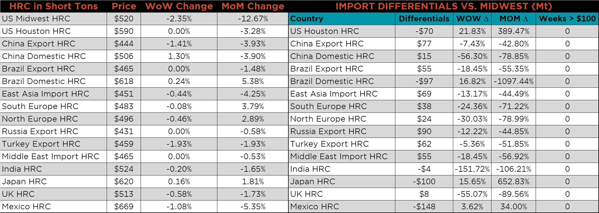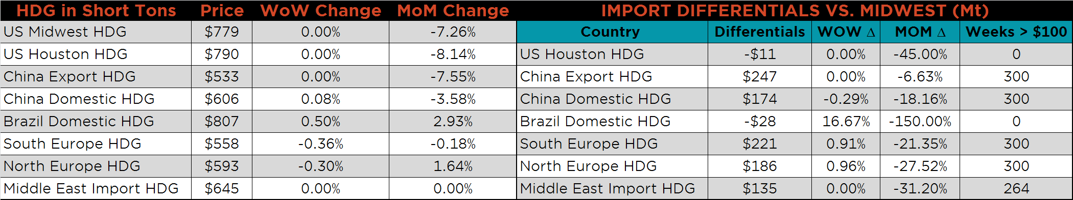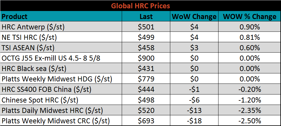 SBB Platt’s HRC, CRC and HDG pricing is below. Midwest HRC and CRC prices were lower on the week, down 2.35% and 2.5%, respectively. Turkey and Chinese HRC export prices were down 1.93% and 1.4%, while the remainder of the major producers showed little change in prices.