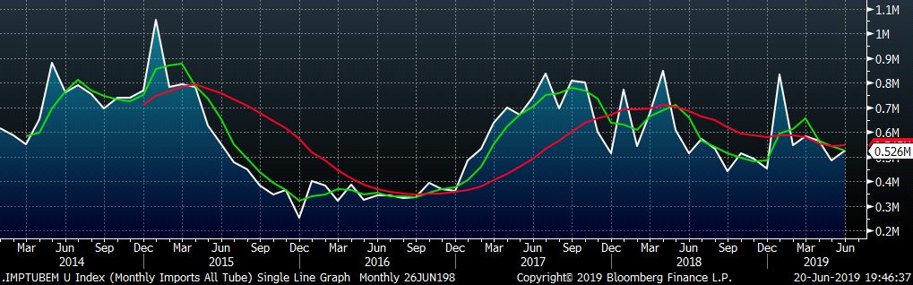 June tube import license data is forecasting a MoM increase of 41k to 526k tons.