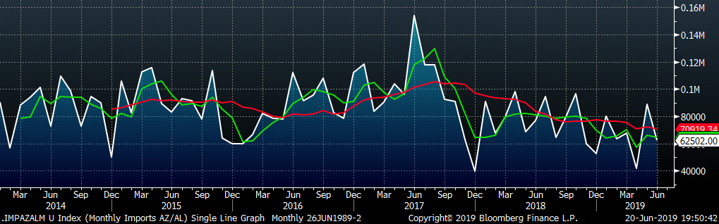 AZ/AL import licenses forecast a decrease of 26k MoM to 62k in June.