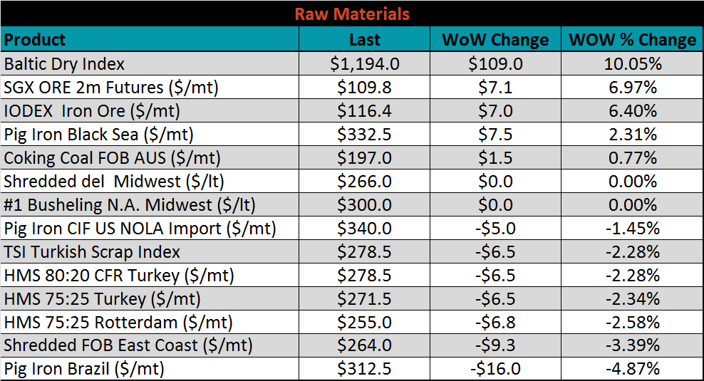 Raw material prices were mixed with SGX iron ore futures gaining 6.97%, while Brazil pig iron fell 4.87%.