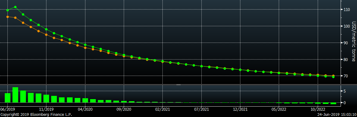 Below is the iron ore future curve with Friday’s settlments in green, and the prior week’s settlements in orange.