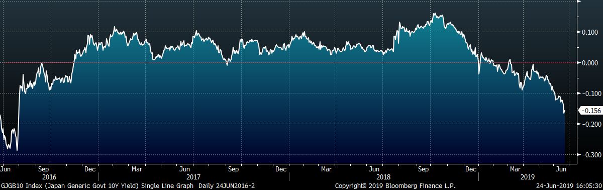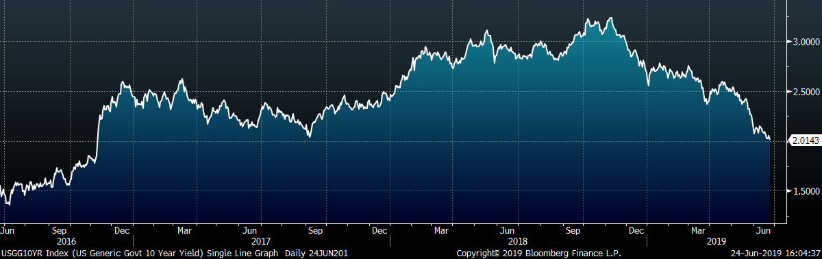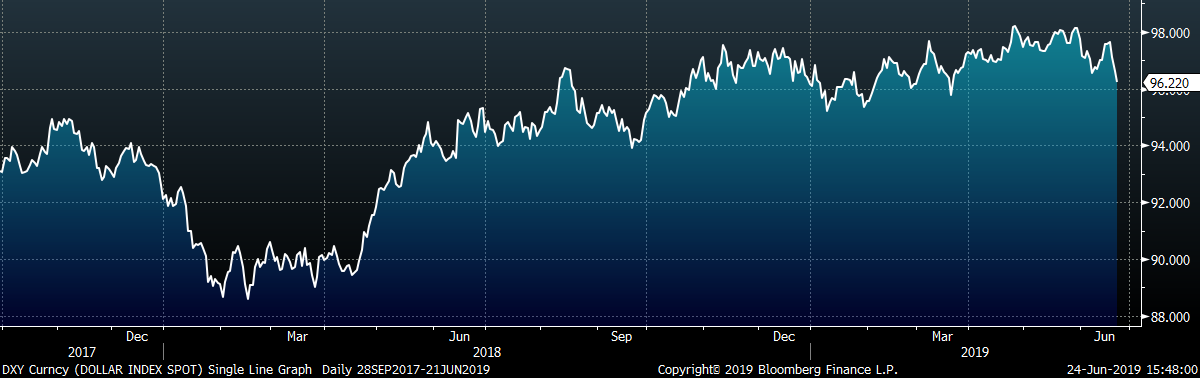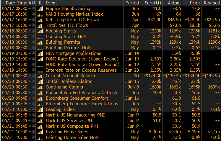 The remainder of the pertinent economic data is to the right. The FOMC left rates unchanged at their monetary policy meeting last week, but signaled that a rate decrease is likely at their meeting taking place at the end of July. The manufacturing data released last week was disappointing, with the Empire State, Philadelphia Fed and Markit manufacturing reports all down MoM and missing expectations.