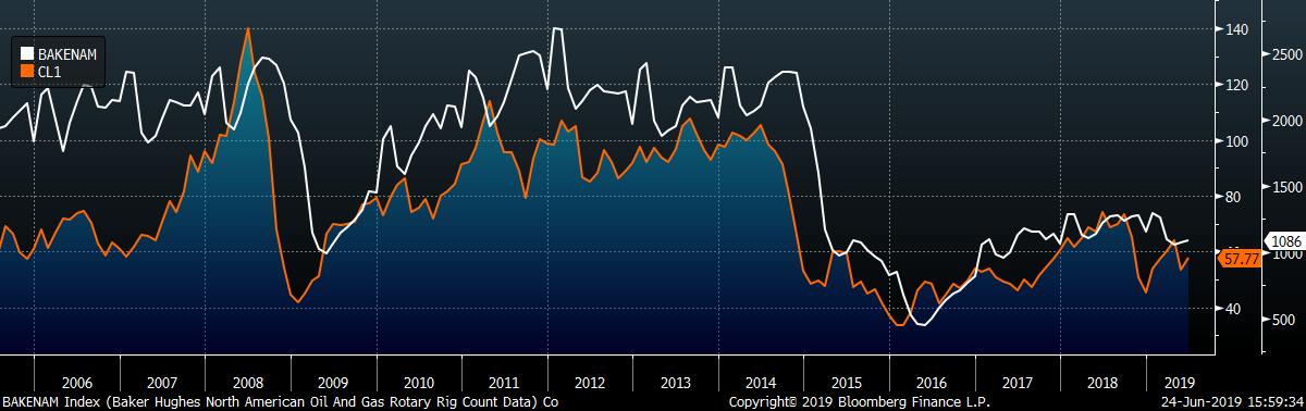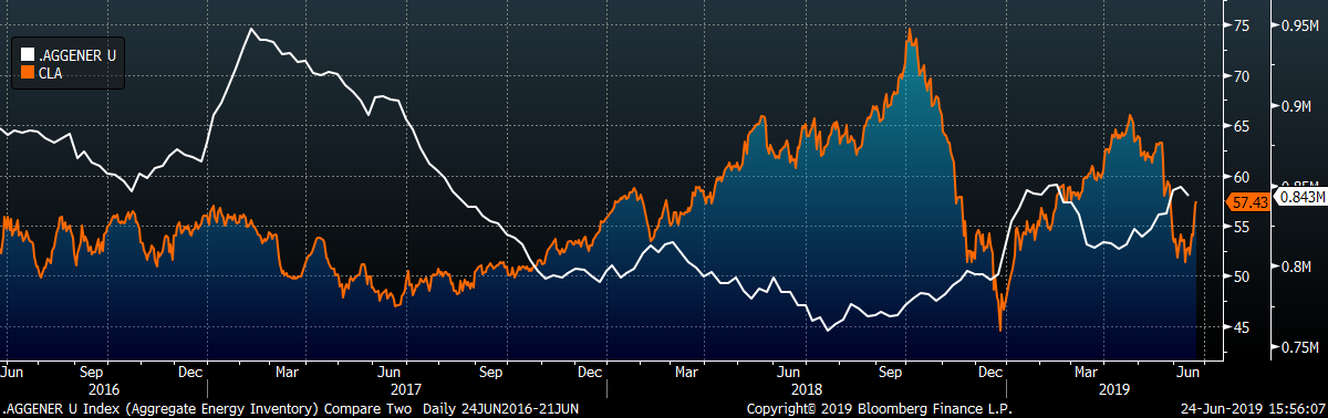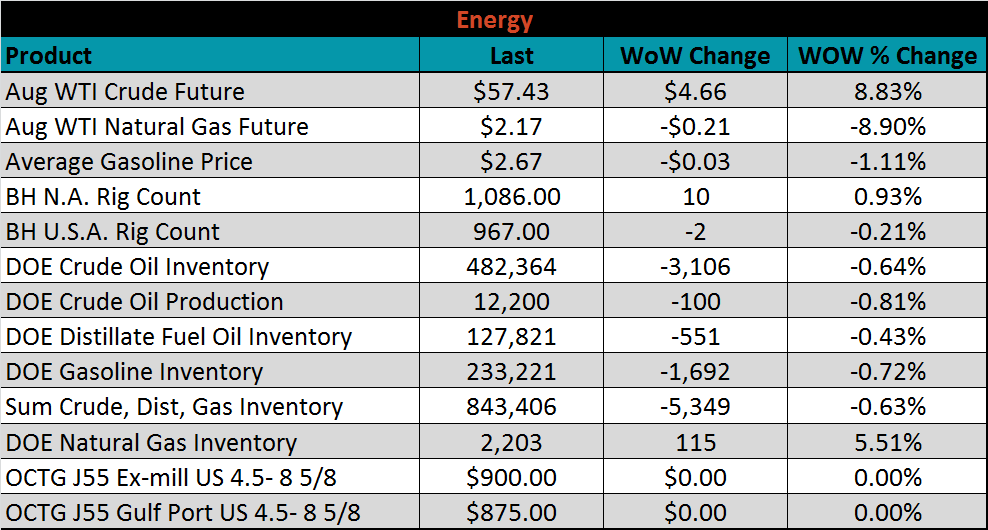 Last week, the Aug WTI crude oil future gained $4.66 or 8.83% to $57.43/bbl. The aggregate inventory level was down 0.6%, and crude oil production fell to 12.2m bbl/day. The Baker Hughes North American rig count gained ten rigs while the U.S. lost two.