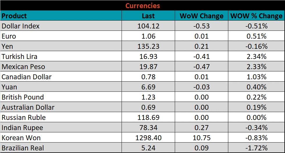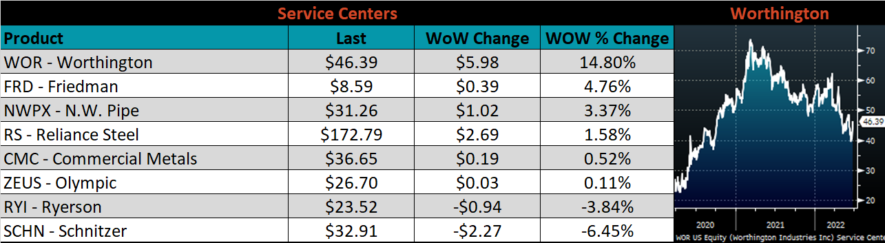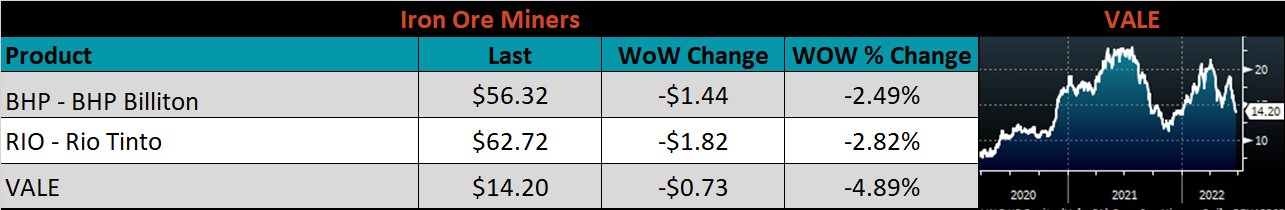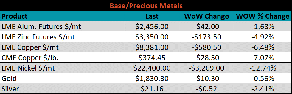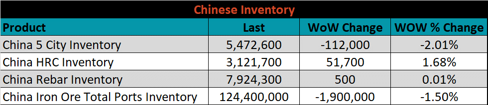 Below is the Midwest HRC price vs. each listed country’s export price using pricing from SBB Platts. We have adjusted each export price to include any tariff or transportation cost to get a comparable delivered price. Differential data was mixed across the board with China increasing 6.77% and Brazil falling 5.97%.