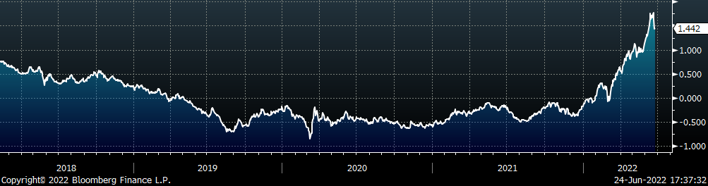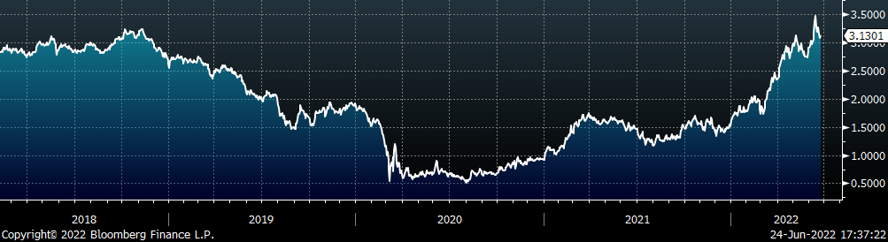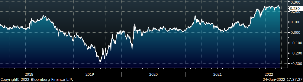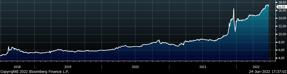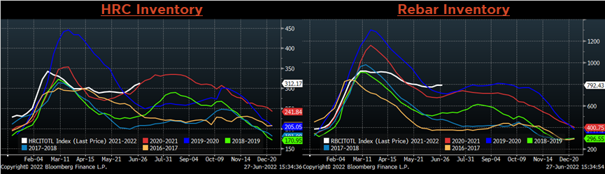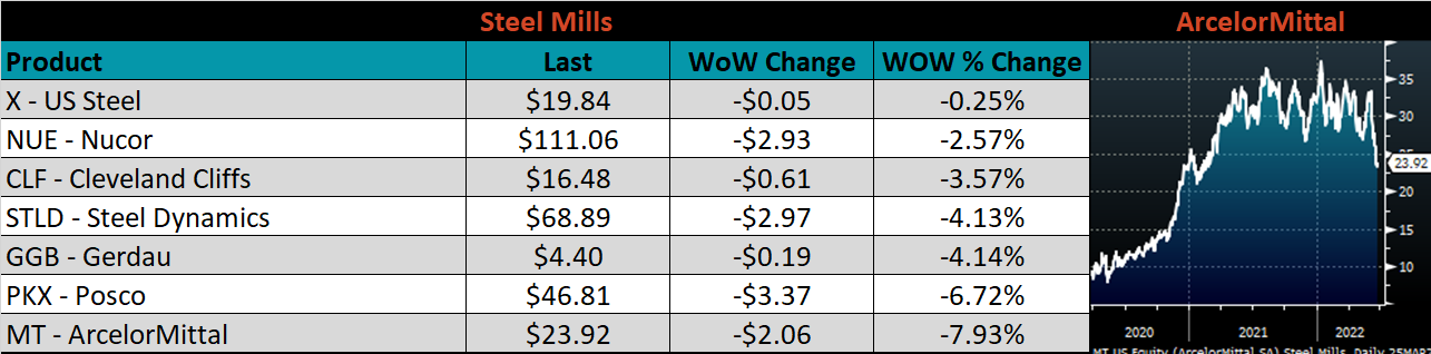 The CME Midwest HRC futures curve is below with last Friday’s settlements in white. The entire curve shifted lower except for the front month, Jun-22 contract. The largest shift down can be observed in the midsection of the curve with a $70 decrease in Aug-22.