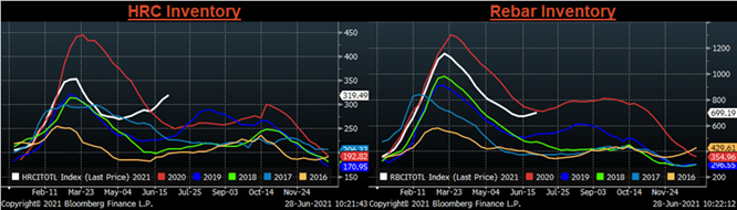 Now that we are 10-months into the rally, we see that imports are well above last year and at their highest sustained levels since 2018, which was supposed to kill the price rally. In contrast, all the current data (and our own experience) shows that inventories have, in fact, decreased significantly since January. The result up to this point is clear – Demand strength at high prices continues to be underestimated in analyst forecasts, and buyers’ inability to restock is causing a hand-to-mouth dynamic that is driving prices higher and inventories lower. To solve the structural shortage, sustained higher levels of imports are required. A risk to that occurring is the fact that imports tend to decrease going into the end of the year when taxes on inventory become a part of a steel buyer’s calculation. Operating in an unprecedented price environment increases uncertainty; however, the imbalance between supply and demand has driven the rally up to this point. Consumers not buying material that it is available when they have the backlog to support it will drive domestic prices higher by diminishing competition at the mills.