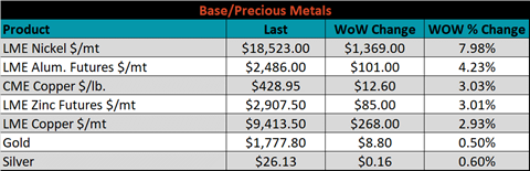 SBB Platt’s HRC, CRC and HDG pricing is below. The Midwest HDG, HRC, & CRC prices were up, 4.9%, 3.2% and 0.6%, respectively. Globally, the Mexican domestic HRC price was up 6.7%.