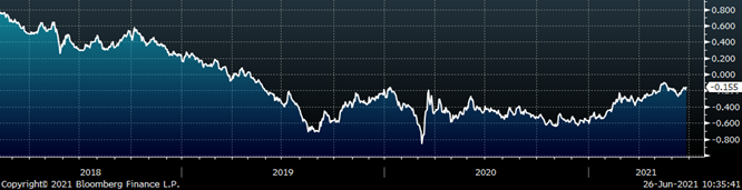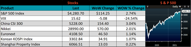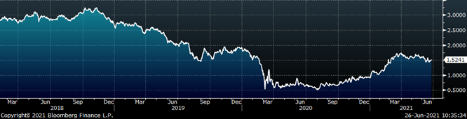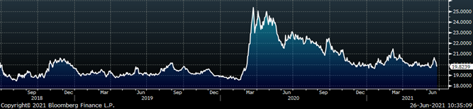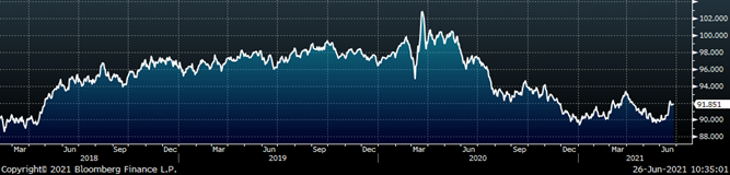 Last week, the August WTI crude oil future was up another $2.76 or 3.9% to $74.05/bbl. The aggregate inventory level was down 1%, and crude oil production was down to 11.1m bbl/day. The Baker Hughes North American rig count was up 9 rigs, and the U.S. rig count was unchanged.