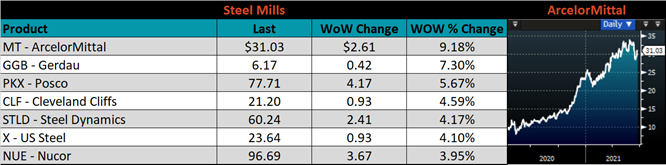 The CME Midwest HRC futures curve is below with last Friday’s settlements in white. Last week, the entire curve shifted higher, most significant in later months.