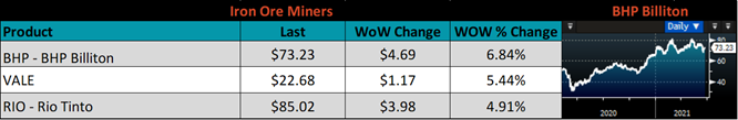 Below is the iron ore future curve with Friday’s settlements in orange, and the prior week’s settlements in green. Last week, the entire curve shifted slightly higher.