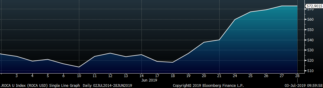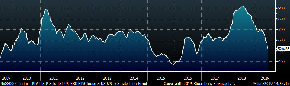 Elevated iron ore prices over the last several months have put pressure on producer profits, especially in China. However, over the last few weeks, HRC prices in China have risen, alleviating this pressure. At FGM, we have been focusing on the China export price, as a proxy for the Southeast Asia price, relative to the domestic price. These prices have been converging, and their relationship is at historically low levels. As the Chinese export price continues to increase, upside price pressure on the US domestic price should increase as well. Below is the Chinese spot HRC price, displaying its large increase during the second half of June.