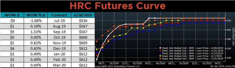 The CME Midwest HRC futures curve is shown below with last Friday’s settlements in white. The back of the curve shifted to the highest levels in the last 4 weeks.