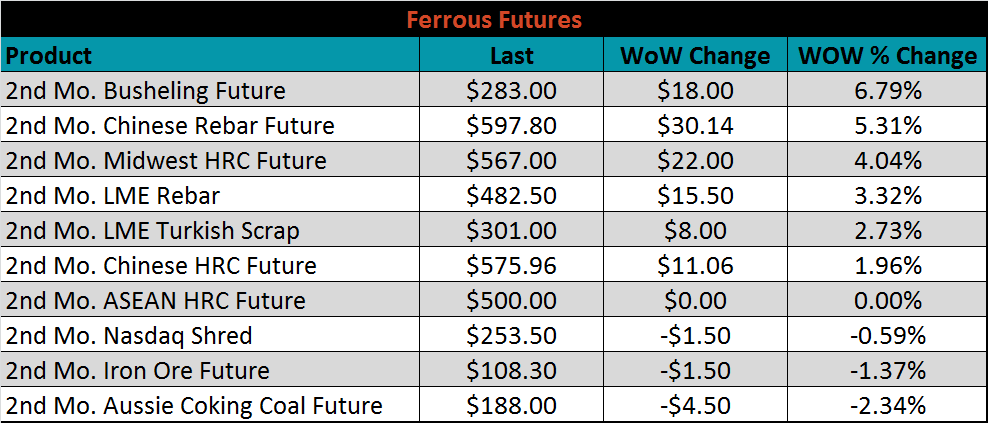 July ferrous futures were mixed. The busheling future gained 6.8%, while coking coal lost 2.3%.