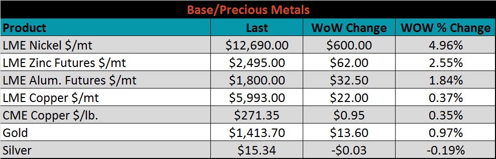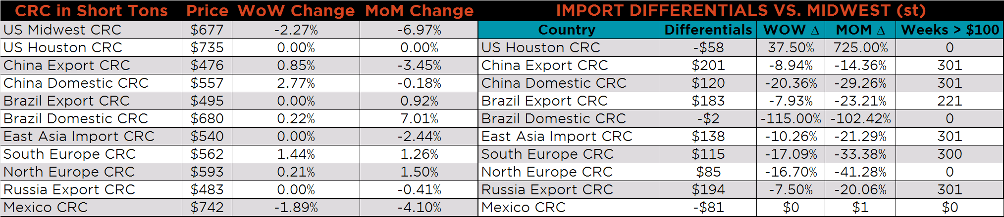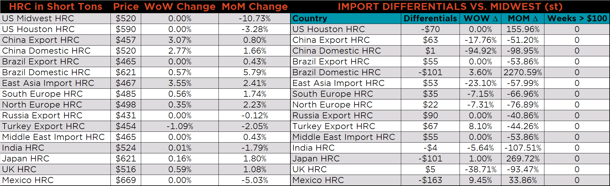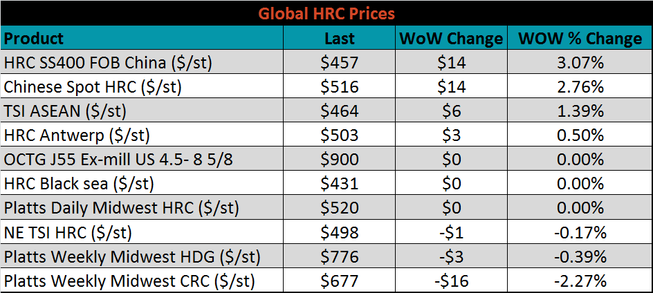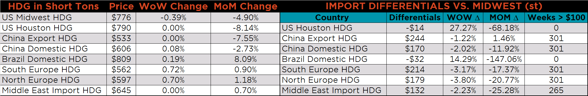 SBB Platt’s HRC, CRC and HDG pricing is below. Midwest HRC was unchanged, while CRC and HDG were lower on the week, down 2.3% and 0.4%, respectively. The Chinese HRC export price was up 3.1%, while the remainder of the major producers showed little change in prices.