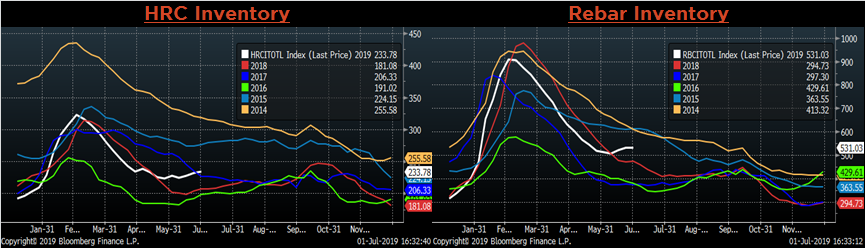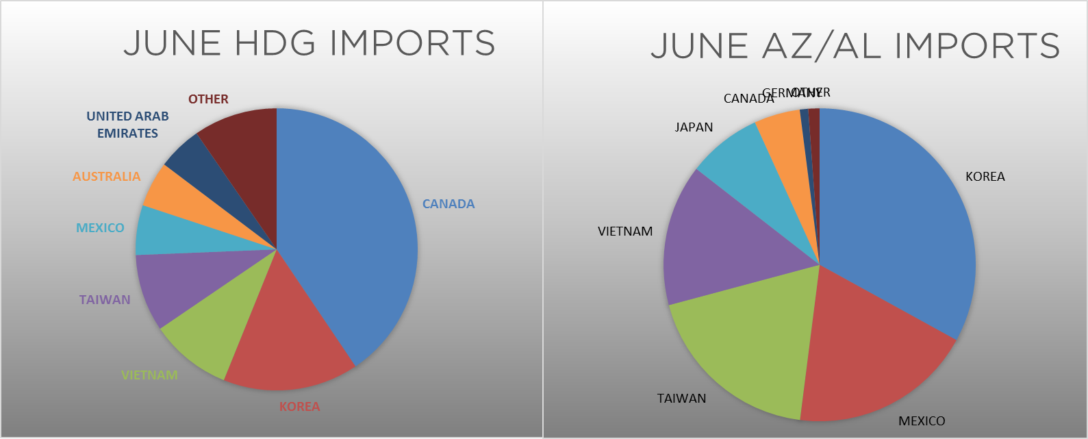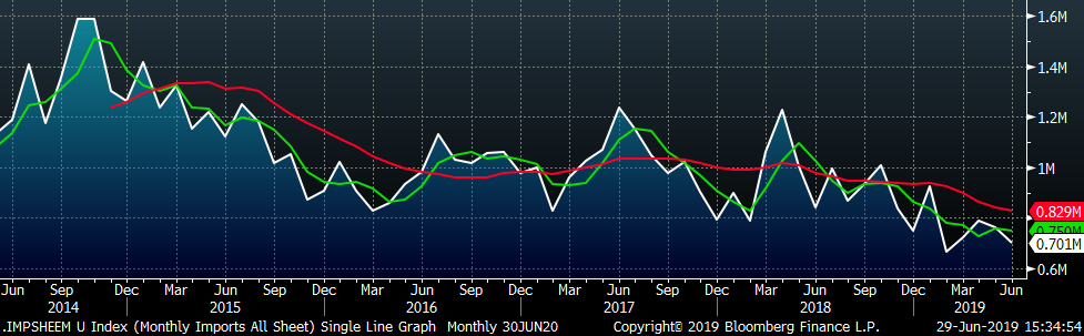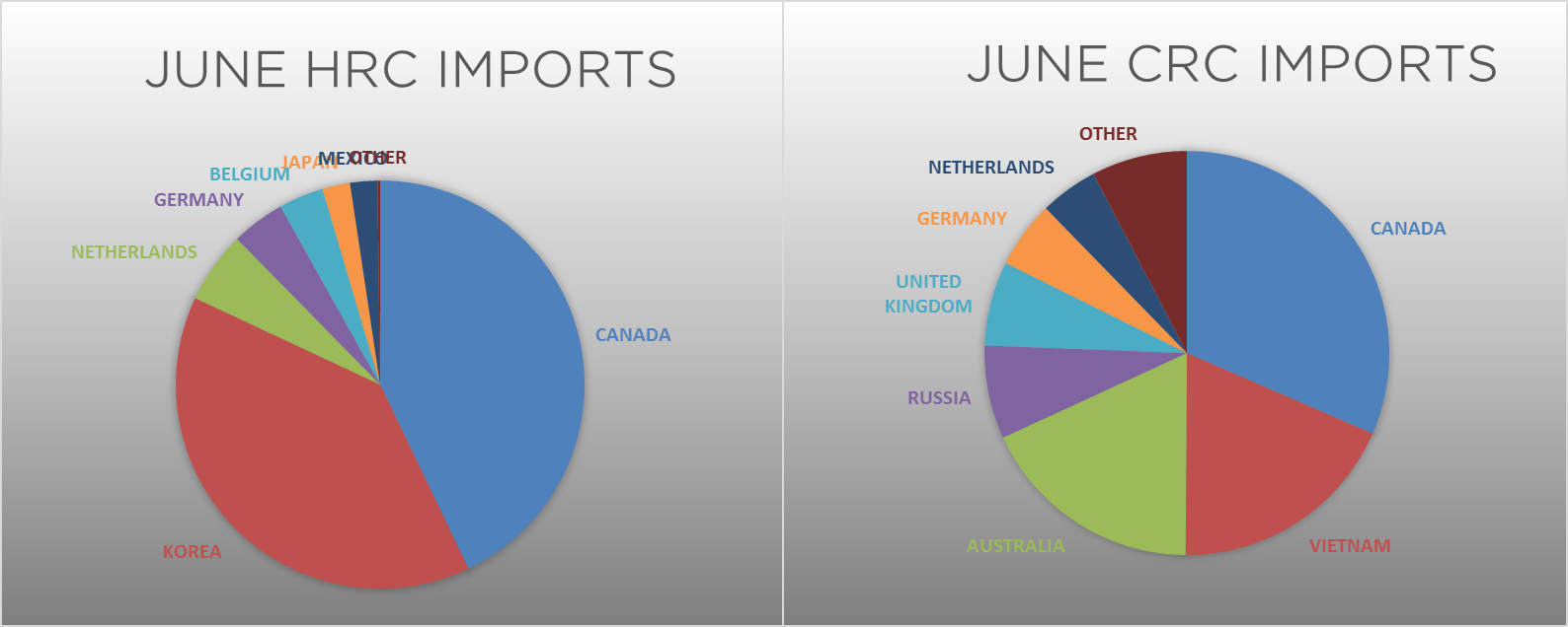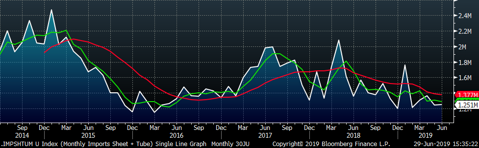 June flat rolled import license data is forecasting a decrease to 701k, down 40k MoM.