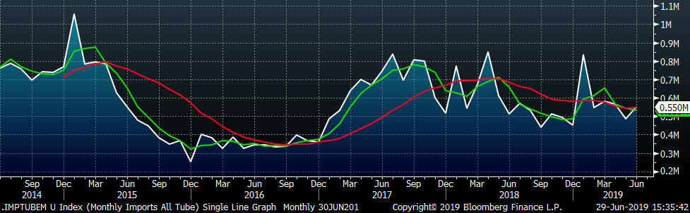 June tube import license data is forecasting a MoM increase of 54k to 550k tons.