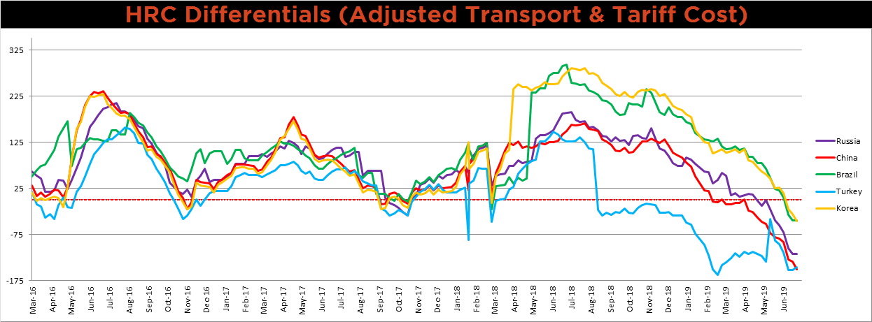 Below is HRC Midwest vs. each listed country’s export price differential using pricing from SBB Platts. We have adjusted each export price to include any tariff or transportation cost to get a comparable delivered price. The Midwest, Brazilian and Russian prices were unchanged last week, while the Chinese and Korean prices rose, and the Turkish price fell. The differentials are at the lowest levels of the last 3 years, with the exception of the Korean differential. Historically, the negative differentials do not last for extended periods.