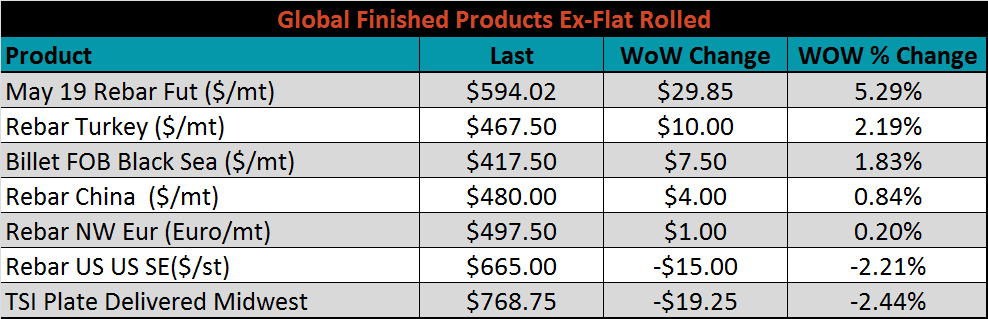 The global flat rolled indexes were mixed. Chinese export HRC was up 3.1%, while Platts Midwest CRC index was down 2.3%.