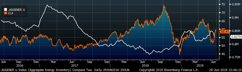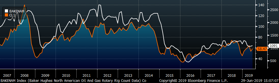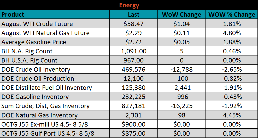 Last week, the Aug WTI crude oil future gained $1.04 or 1.8% to $58.47/bbl. The aggregate inventory level was down 1.9%, and crude oil production fell to 12.1m bbl/day. The Baker Hughes North American rig count gained five rigs while the U.S. count was unchanged.