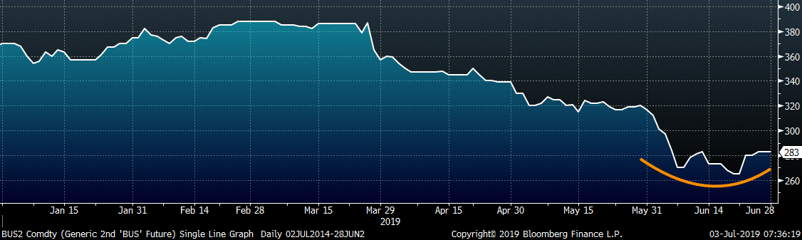 The July scrap market, which two weeks ago many projected to trade down $20 to $30, currently is looking to be down $10 to sideways. This should prevent mini mills from accepting orders at lower prices, raising the bottom of the range of transacted prices. The forward curve for busheling scrap is in contango, just like the HRC curve, implying that the market expects scrap to trade higher in the months ahead. This would support further price increase announces. The chart below shows the rolling 2nd month busheling future contract, which appears to be bottoming.