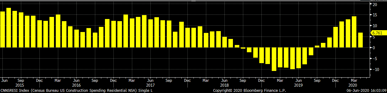 April seasonally adjusted U.S. construction spending was down 2.9% compared to March, but up 3% compared to last April. February and March construction spending was revised significantly higher for both Residential and Non-Residential spending, providing further support to the not-seasonally adjusted figures YTD.