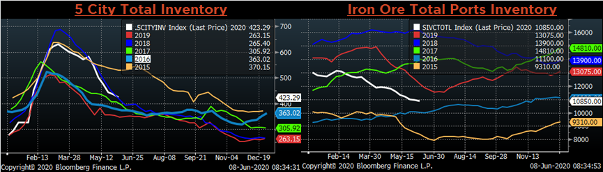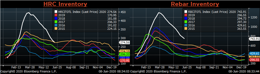 While the official PMI in China fell much lower during the height of their virus outbreak and shutdown, it completely recovered in the next month moving back into expansion. The U.S. manufacturing sector appears to be taking longer to recover due to a phased reopening of the economy, which will affect demand returning to the steel market. It is likely that idled furnaces will come back on with automotive demand simultaneously. However, mini mills have been operating at reduced rates over the last few months and will likely use the recent price rally to increase their production levels as they are currently selling at prices well above their marginal cost of production. With the forward curve in contago (future prices higher than the current spot price), the market is expecting that mills will not ramp up supply at a faster rate than the recovering demand, providing a needed catalyst for the stalled price rally. However, those with different expectations, or those with risk exposure to an alternative scenario playing out, should view the current curve as an opportunity to take advantage of the differing expectations.