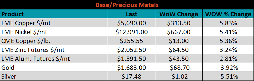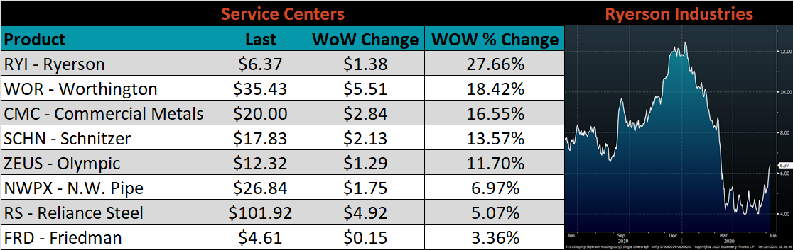 SBB Platt’s HRC, CRC and HDG pricing is below. The Midwest HRC, HDG and CRC prices were up 2.4%, 1.9% and 0.4%, respectively. Globally, the Chinese export CRC and Turkish export HRC prices were up, 3.3% and 2.4%, respectively.
