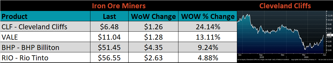 Below is the Midwest HRC price vs. each listed country’s export price using pricing from SBB Platts. We have adjusted each export price to include any tariff or transportation cost to get a comparable delivered price. The Brazilian, Korean, Russian and Chinese differentials all increased, as U.S. domestic price increased. The Turkish price, however, increased at the same rate as the U.S. domestic price and its differential was flat.
