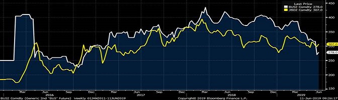 June scrap pricing fell, somewhat unexpectedly, giving mini-mills room to sell HRC at lower prices and maintaining profit. Global raw material prices have remained steady, and iron ore prices continue to remain at elevated levels. This has lead domestic busheling prices to fall below the LME Turkish scrap price. The chart below shows the historical relationship between the two, and how irregular this inversion is.