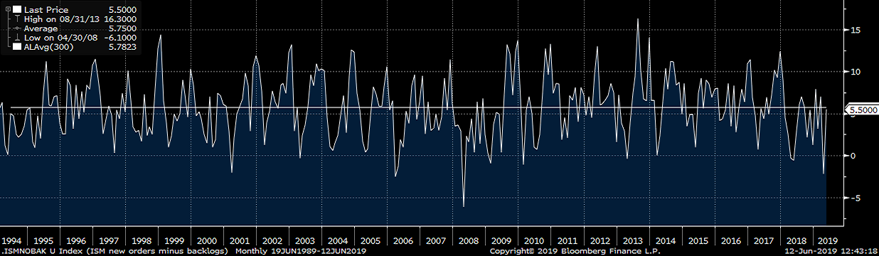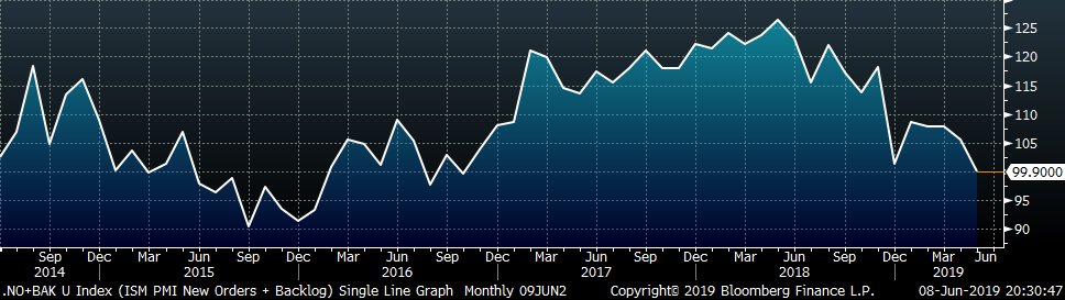 The January ISM new orders subindex rose 1 point to 52.7 while the backlog subindex fell 6.7 points to 47.2. The second chart adds the new orders and backlog subindexes, indicating slightly lower manufacturing demand in May. The third chart is the new orders subindex minus the backlog subindex. As forecasted, their relationship has returned to its historical average, although this was driven by the sharp reduction in backlog.