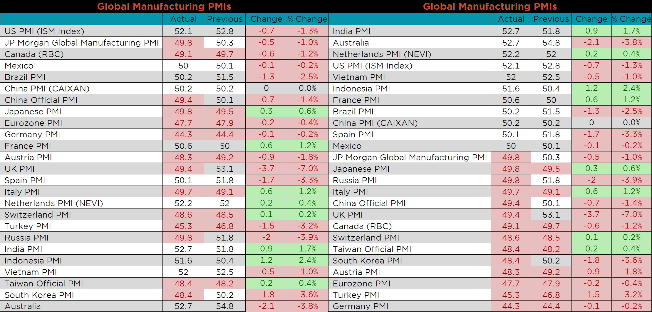 China’s official PMI fell back into contraction, while Caixan Manufacturing PMIs held above 50. This divergence is interesting because the official PMI number is from the government, and its decline may lead to increased stimulus from China’s central bank.