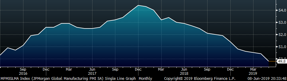 The May global purchasing manager indexes continued to perform worse than the United States with the JP Morgan, Russia, China, UK and South Korea PMIs falling into contraction.